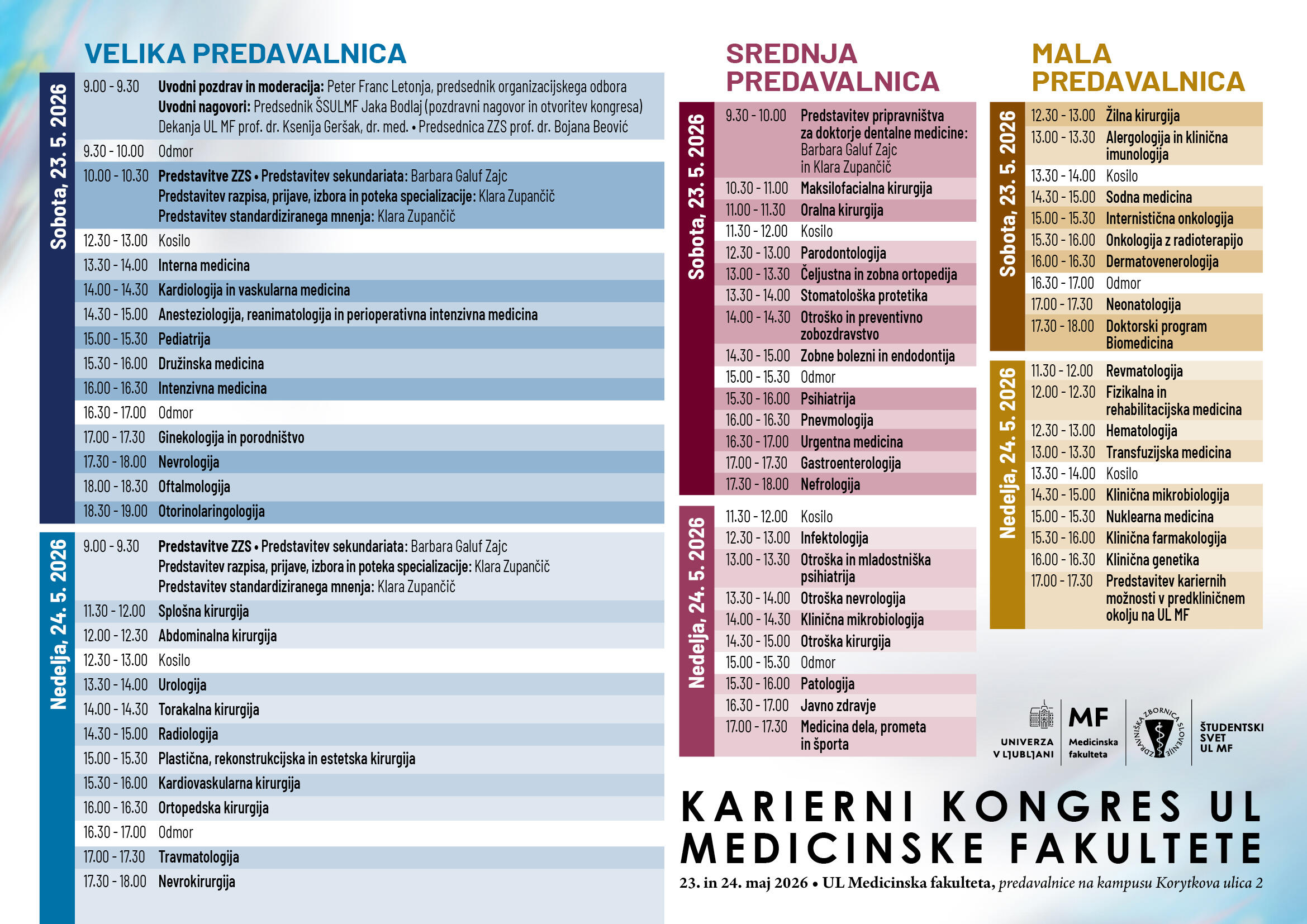Karierni kongres UL MF 2026 poteka v soboto in nedeljo, 23. in 24. maja 2026, v prostorih UL Medicinske fakultete na Korytkovi 2 v Ljubljani. Predstavitve potekajo vzporedno v Veliki, Srednji in Mali predavalnici.